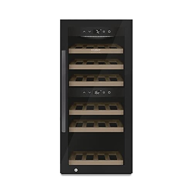 The Caso Design WineExclusive 24 brings smart technology to wine storage with dual temperature zones perfect for red and white wines. This sleek black cooler holds 24 bottles up to 31cm tall across six removable wooden shelves.