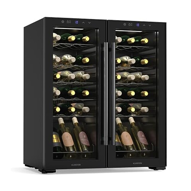 The Klarstein Shiraz wine refrigerator provides professional wine storage for up to 36 bottles with dual temperature zones maintaining optimal conditions for both red and white wines. This freestanding unit operates between 5-18°C with precise touch controls.