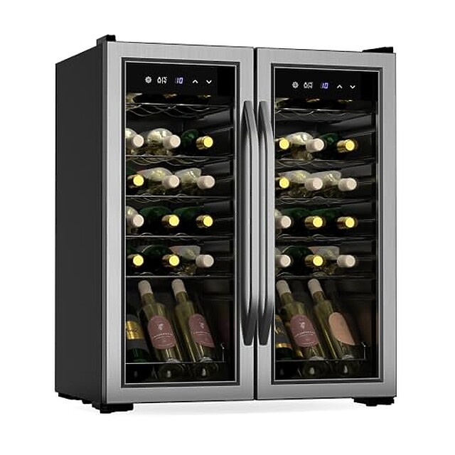 Measuring 82.7cm high by 48.1cm wide, this wine cooler features elegant stainless steel double doors and automatic defrost. The stable metal shelving ensures secure bottle storage whilst maintaining an attractive display for your wine collection.